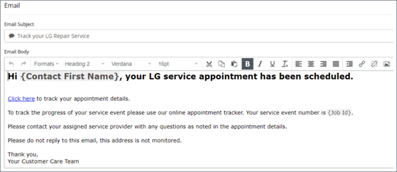 Once LG dispatches the request to a technician, the customer will receive an automated confirmation message via email, SMS, and/or phone call.