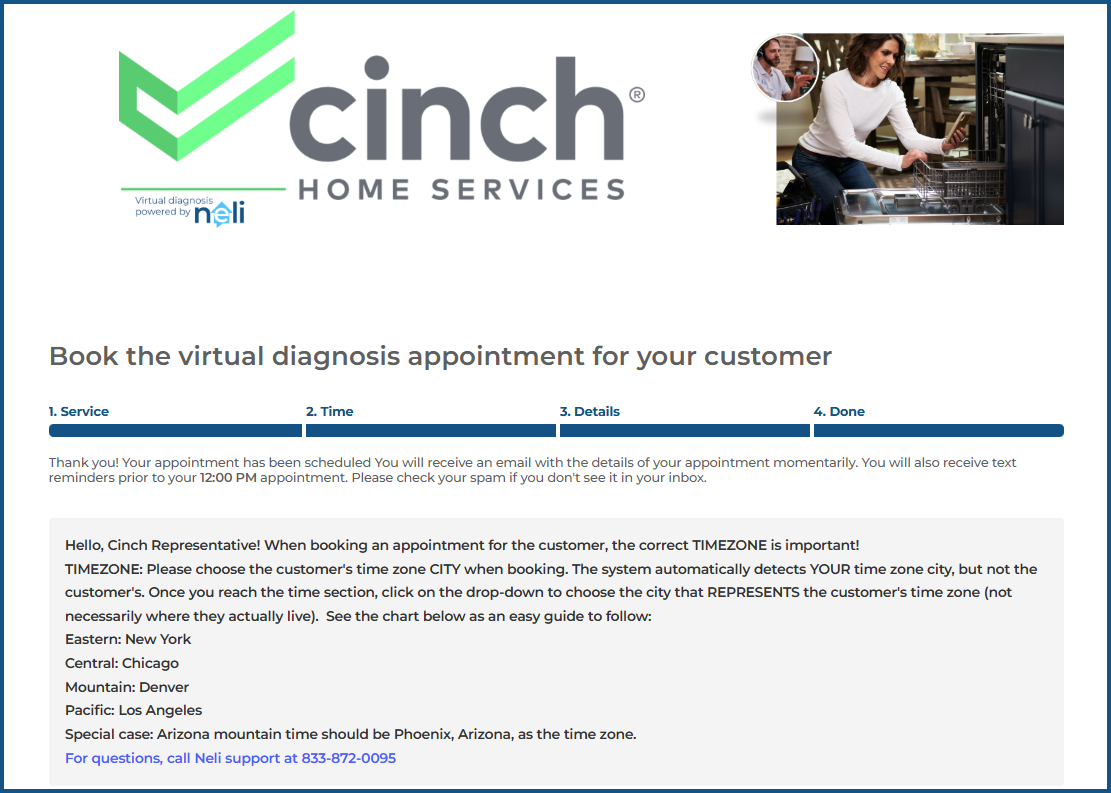 "I’m scheduling a video call appointment with a Neli-certified technician so they can take a closer look at your issue. You’ll hear from them soon with instructions for the visit. If the problem can’t be fixed remotely, they’ll let us know what’s needed so we can send a technician to your home with the right parts to finish the repair." - Open the Cinch - Neli Booking site: https://nelihome.com/book-cinch-appointment/