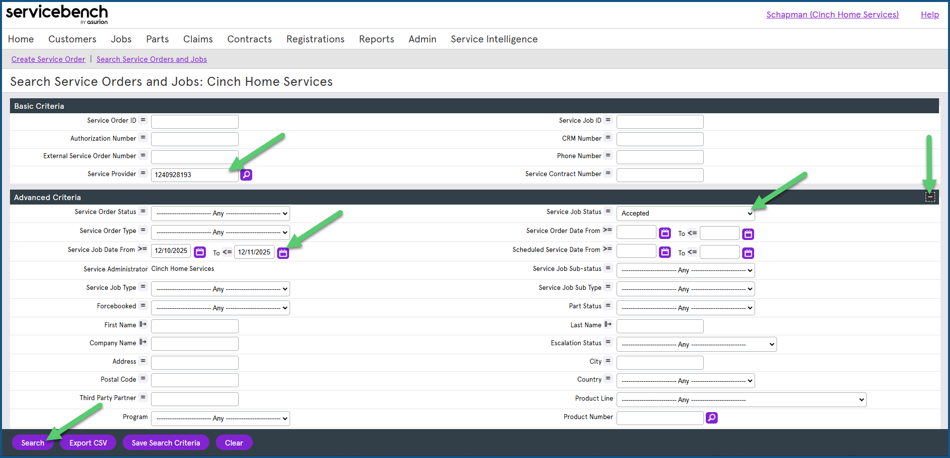 Use the Advanced Criteria to sent the Service Job Status of Accepted and the Service Job Date to search:
