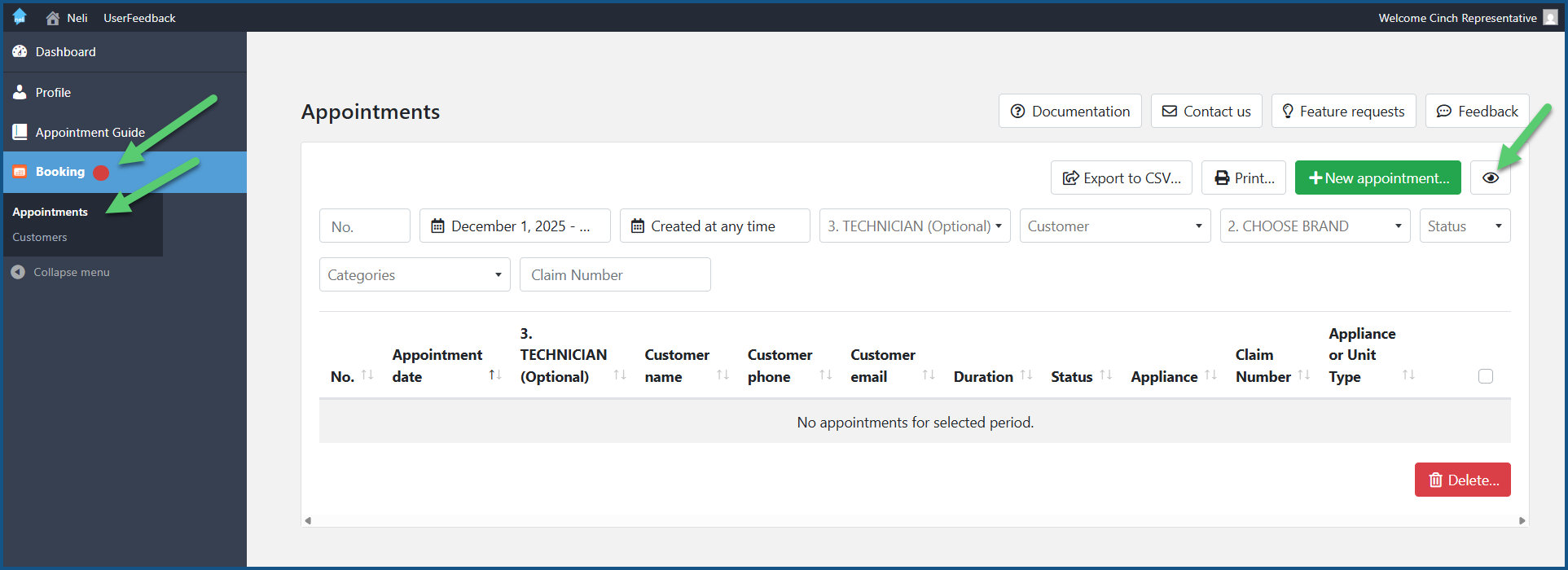 - Once logged into the Neli Dashboard, on the left, hover over Booking and select Appointments.