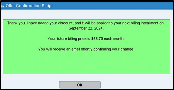 discount, and it will be applied to your next billing installment on [date]. Your future billing price is